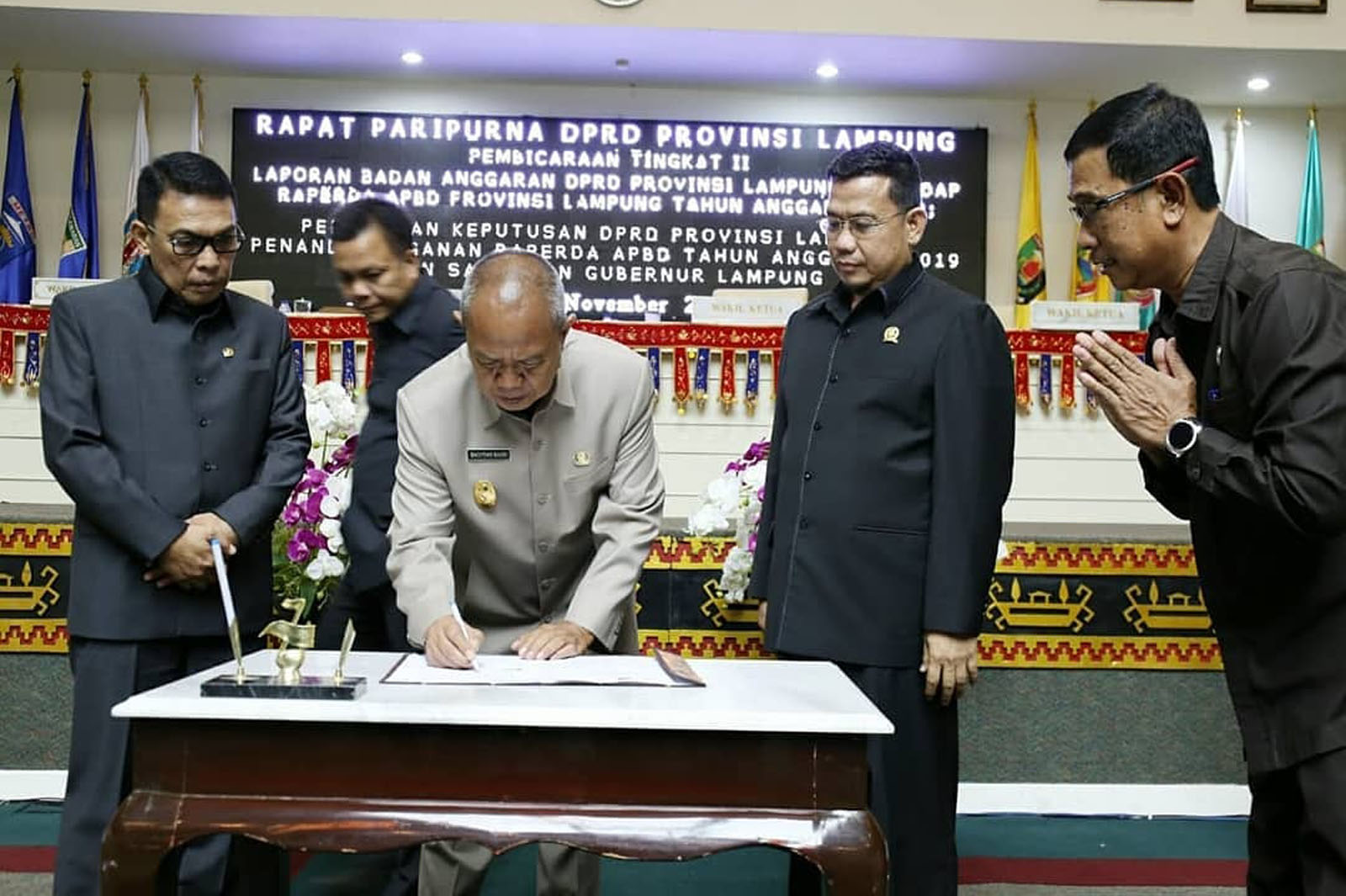 Dewan Perwakilan Rakyat Daerah (DPRD) Provinsi Lampung bersama Pemerintah Provinsi (Pemprov) Lampung sepakati penandatanganan Raperda APBD tahun 2019 yang merupakan satu kesatuan dalam dokumen laporan Badan Anggaran (Banang) DPRD dalam RAPBD tahun 2019.Rapat paripurna Badan anggaran,keputusan DPRD dan persetujuan bersama terhadap Raperda tentang AP...